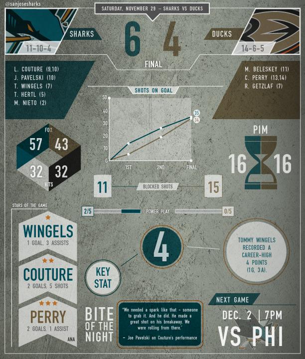 Couture gutted it out (he looked a bit green during warm ups; had been at hospital most of the day getting antibiotics via IV for swollen face near eye), and notched two goals. Wingels had a big night (1G, 3A — new career high), and Long Beach native Nieto broke his goalless streak.